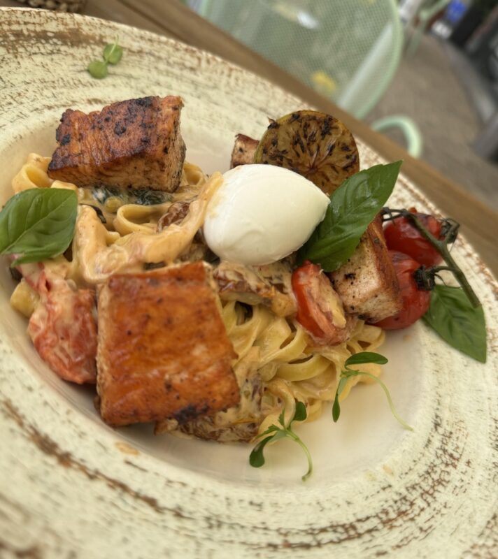 Kóstold meg a legújabb ajánlatunk tésztakülönlegességét! Krémes fehérboros-tejszínes szószban fürdő taglietelle, grillezett lazaccal, spenóttal és aszalt paradicsommal. Egy falatnyi elegancia - chef ajánlásával.