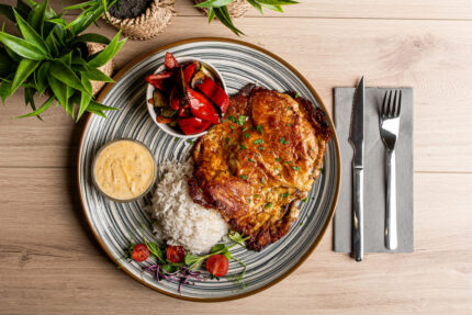 Kívül ropogós, belül olvadt sajt és szaftos sonka – igazi ízbomba! A vegyes köret tökéletesen kiegészíti ezt a bőséges fogást.