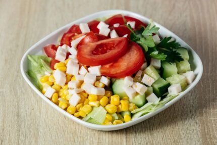 A mediterrán ízek kedvelőinek: friss salátalevél, uborka, paradicsom, olívabogyó és feta sajt, olívaolajjal meglocsolva.