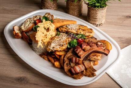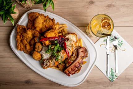 Egy igazi ízkavalkád, amelyet a változatosság és a házias ízek jellemeznek. A gazdagon megpakolt tál tartalmazza a hagyományos fűszerezésű cigánypecsenyét, a zamatos sajttal-sonkával töltött csirkemellet, a kívül ropogós, belül krémesen lágy rántott karfiolt és gombát, valamint az ínycsiklandó, omlós rántott karajt. A köretként kínált rizs és hasábburgonya tökéletes egyensúlyt teremt az ízek között, így garantáltan minden falat élvezet lesz.